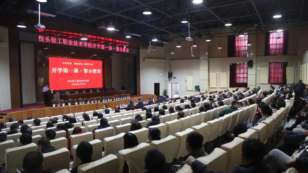 2024 年 2 月 28 日,包头轻工职业技术学院纪委办公室组织了 3 场开学第一课·警示教育,学院党委书记邵文祥,党委副书记、院长冯银虎及学院党委领导班子全体成员、学院全体党员和副科级以上领导干部共 500 余人参加,学院党委委员、纪委书记范维瑾主持警示教育。