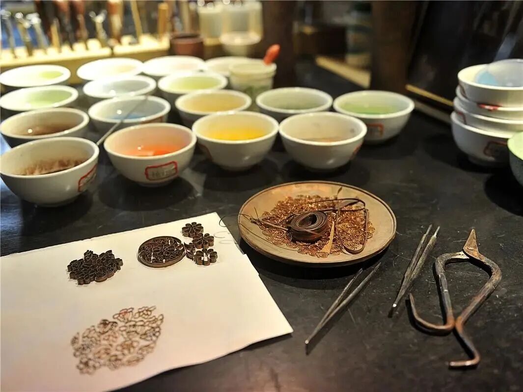 珐琅又名“景泰蓝”,它以金银铜及多种天然矿物质为原材料,集美术、工艺、雕刻、镶嵌、玻璃熔炼、冶金、设计等专业技术为一体,古朴典雅,精美华贵,被称为国宝“京”粹。一点一点把细扁铜丝掐出线条,在银、铜等金属胎体上捏出各种图案花纹,再将五彩珐琅点填在花纹内,经过烧制、磨平、镀金等百道工序,一个外观晶莹润泽、鲜艳夺目的珐琅工艺品就诞生了。