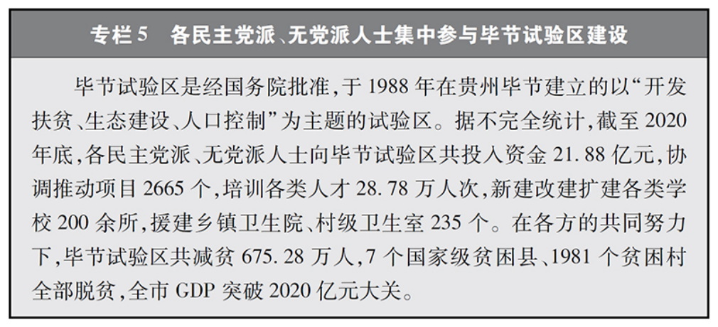 拓展发挥作用的渠道和途径。各民主党派、无党派人士积极推动和实施智力支边、温暖工程、思源工程等活动,参与职业培训、兴教办学、捐资救灾、扶危济困等公益事业,积极助力打赢脱贫攻坚战。团结各自成员和所联系群众,反映意见诉求,重点就教育体制改革、医疗体制改革、美丽中国建设、促进就业创业、加强社会保障体系建设等人民群众普遍关心的重点难点问题提出意见建议,发挥了桥梁纽带和凝聚共识作用。拓展与港澳同胞、台湾同胞、海外侨胞的联系,促进两岸关系和平发展,遏制“台独”分裂势力,推进祖国统一大业。