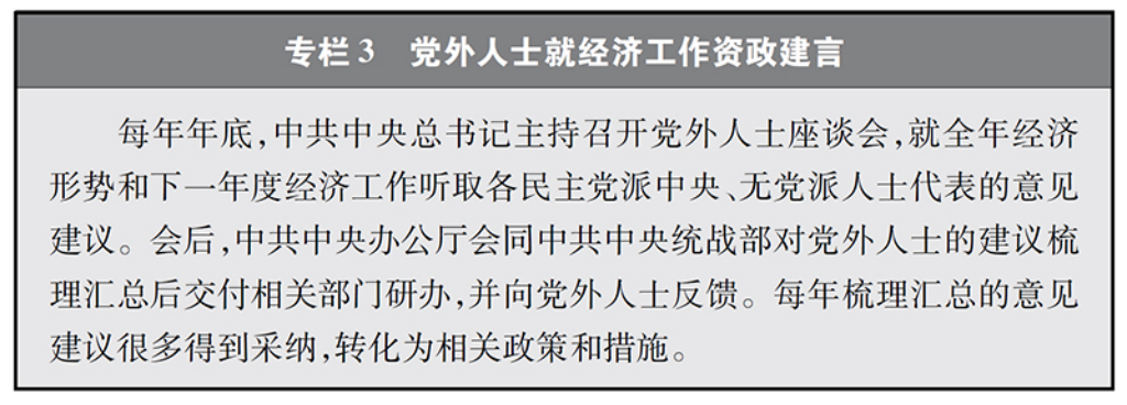 围绕国家方针政策的制定和重大战略的实施献计出力。就国家政治、经济、社会生活中的全局性、战略性、前瞻性重大问题开展考察调研,提出意见建议,是各民主党派、无党派人士发挥作用的重要渠道。多年来,各民主党派中央、无党派人士围绕“一带一路”建设、京津冀协同发展、长江经济带发展、粤港澳大湾区建设、长三角一体化发展、创新驱动引领高质量发展、推进供给侧结构性改革等关系国计民生的重大问题深入考察调研,向中共中央、国务院提出的许多意见建议被采纳。中国共产党积极完善知情明政机制、考察调研机制、工作联系机制、协商反馈机制,为各民主党派、无党派人士知情出力创造条件。