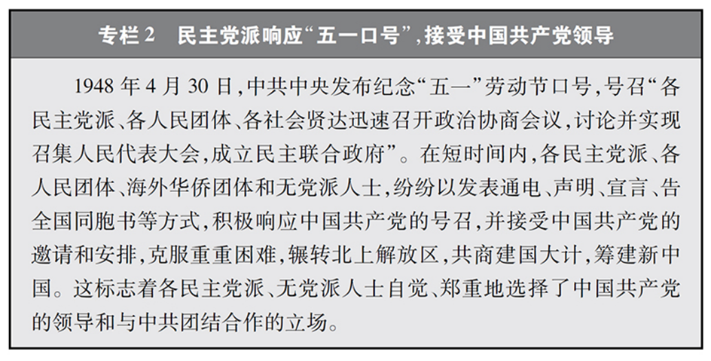 中国新型政党制度形成于协商筹建新中国的伟大实践。1948年4月,中国共产党发布纪念“五一”劳动节口号,提出召开政治协商会议、成立民主联合政府的主张,得到各民主党派、无党派人士和社会各界热烈响应,标志着各民主党派、无党派人士公开自觉接受中国共产党的领导,揭开了中国共产党同各党派、各团体、各族各界人士协商建国的序幕,奠定了中国共产党领导的多党合作和政治协商制度的基础。1949年9月,中国人民政治协商会议第一届全体会议召开,通过《中国人民政治协商会议共同纲领》,规定:在普选的全国人民代表大会召开以前,由中国人民政治协商会议的全体会议执行全国人民代表大会的职权。在普选的全国人民代表大会召开以后,中国人民政治协商会议得就有关国家建设事业的根本大计及其他重要措施,向全国人民代表大会或中央人民政府提出建议案。中国新型政党制度由此确立。