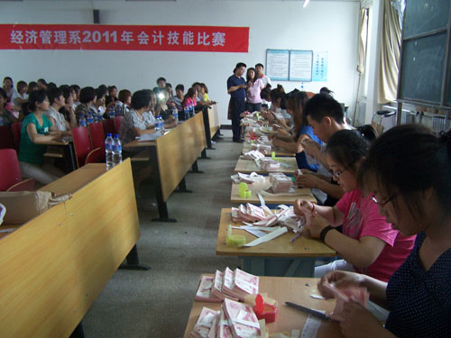 为了提高学生的专业技能和专业水平,使之更加符合高职学校的培养目标要求,提高学术氛围,增强赶、帮、超”的学习气氛,6月21日下午,在教学楼608室经济管理系财会与金融教研室举办了第一届会计技能大赛,系领导、全系教师及200余名财务管理专业学生观看了比赛。孟多卿、乔雪芹、邢爱华等会计专业教师担任比赛评委。白秀珍老师主持此次技能比赛。参加此次比赛的选手为我系2010级财务管理专业的80名在校生。