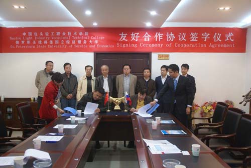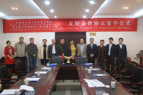 我院领导首先对来访贵宾表示热烈欢迎,随后着重介绍了我院国际化办学的设想和发展规划等,并希望两校能以此次签订友好合作协议为契机,相互信任、共谋发展,为两校的发展做出贡献。随后,俄方副院长详细介绍了圣彼得堡国立经济与服务大学的发展历史、教学科研等情况,她表示两校在很多专业领域方面有相似或互补之处,合作基础稳固,前景广阔,希望双方能在平等互信的基础上加强交流和合作并希望合作取得成效。之后,双方就合作创办包头轻工职业技术学院欧亚国际学院事项进行了深入磋商及讨论,签署了合作创办欧亚国际学院协议。