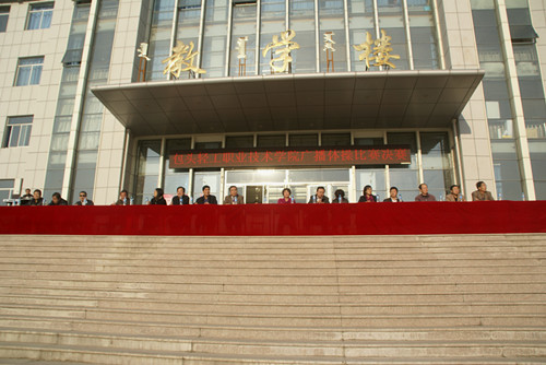 2011年11月10日学院广在教学楼广场举行广播体操比赛,学院党委副书记、纪检委书记董全进、学院战略发展委员会委员、督导办主任武瑛及学生工作部、宣传部、教务处、保卫处、各系(中心)、附属中专相关领导出席并观看比赛。