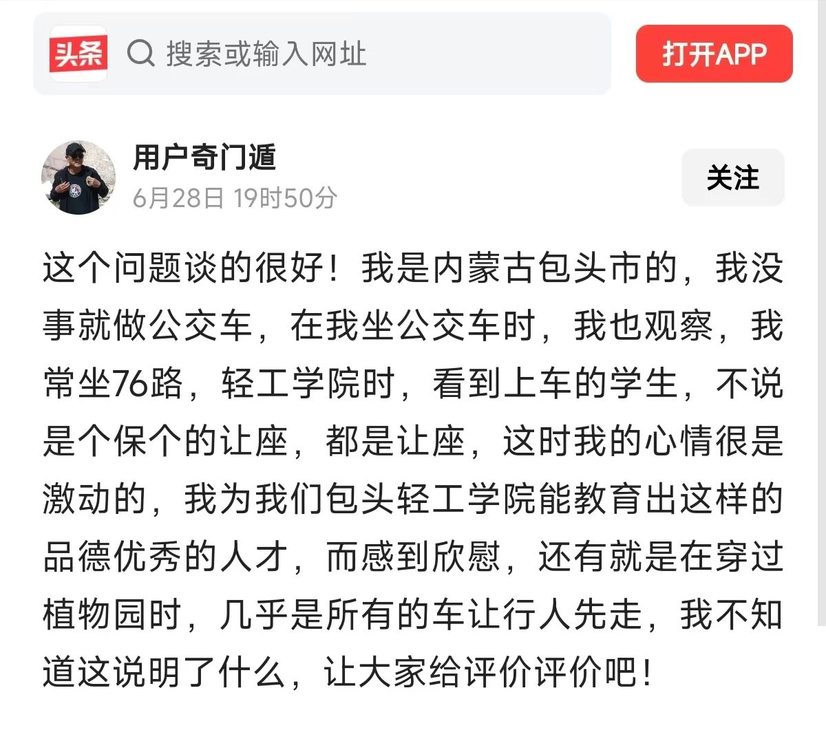 这是“今日头条”APP上的一条评论,这名网友对轻院学子的让座行为大加赞扬。这条评论获得了111个“赞”、50条评论和30个“收藏”,大家对包头市的社会风气与轻工学院学生的文明素养赞不绝口。