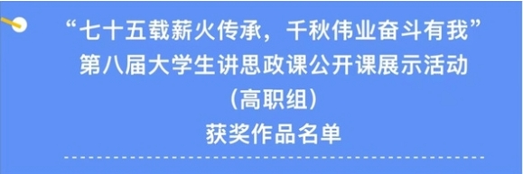 近日,教育部公布了第八届习近平新时代中国特色社会主义思想大学习领航计划主题教育活动获奖结果。我院马克思主义教学与研究部选送的参赛作品《额禽》《红色的嫩芽》分别荣获“第八届全国高校大学生微电影展示活动”长视频组二等奖与三等奖;《日出东方五星闪耀 七十五载一城芳华》获得“第八届大学生讲思政课公开课展示活动”高职组三等奖。