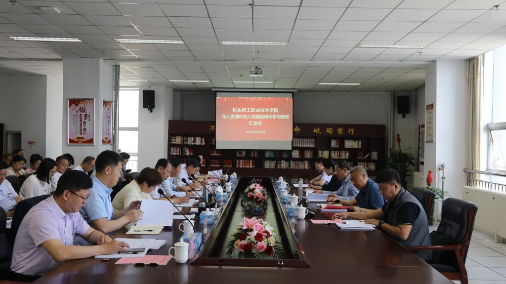 5月28日,包头轻工职业技术学院举行深入贯彻中央八项规定精神学习教育汇报会暨党委理论学习中心组2025年第9次学习(扩大)。自治区党委深入贯彻中央八项规定精神学习教育第三督导组全体成员到会调研指导,会议由党委书记邵文祥主持。学院党委领导班子成员、正处级干部参加会议。