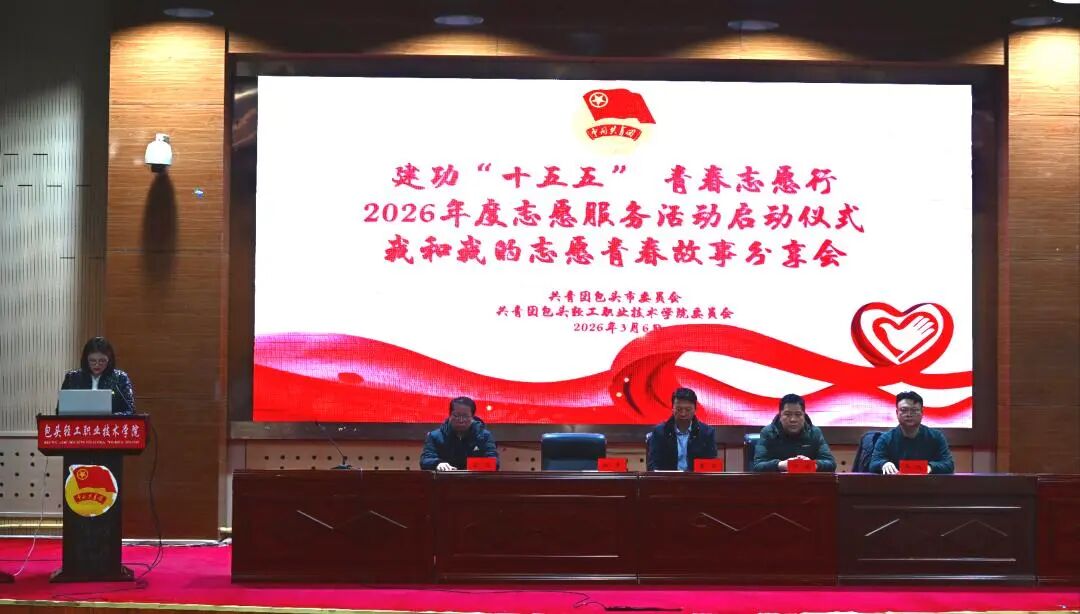 近日,学院举行建功“十五五”青春志愿行2026年度志愿服务活动启动仪式我和我的志愿故事分享会。包头团市委宣传部部长鲁岳,学院团委书记林青出席活动,各系部党总支副书记、团总支书记,青年志愿者服务队代表及学生代表参加活动。
