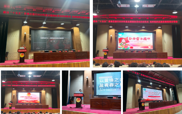 包头团市委宣传部部长鲁岳为学院13支志愿服务队授旗;优秀志愿者代表带领全体学生庄严宣誓,并发出学雷锋活动倡议,生动诠释“奉献、友爱、互助、进步”的志愿精神。五名宣讲人分享自身志愿服务经历、实践故事和成长感悟,引发在场师生强烈共鸣,进一步凝聚学院青年参与志愿服务、践行雷锋精神的青春热情。